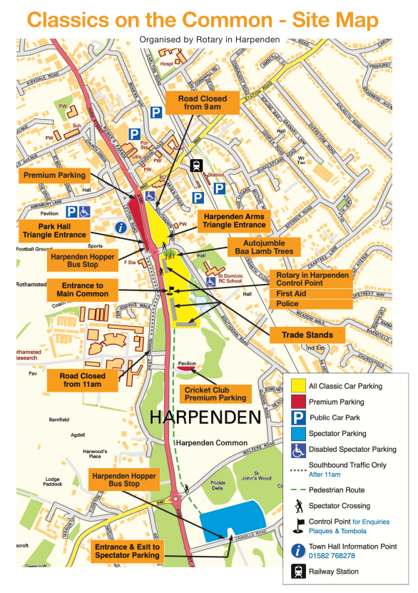 Ensure that you arrive with your ticket clearly displayed in the windscreen of your vehicle. Etickets will be checked with a card reader if not printed. Please contact us NOW if you have not received a ticket. Tickets purchased online have been sent to you by text. Access to the Main Common for those who have paid £17 (including bikes and pre 1930 cars) will be available from 11.30am and NOT before. Access to the Main Common for all other ticket holders will be from 2.00pm and NOT before. If possible, please arrive by 4pm at the latest and do not leave until after 5.00pm. When the Main Common is full, vehicles will be directed to park on the Harpenden Arms triangle.